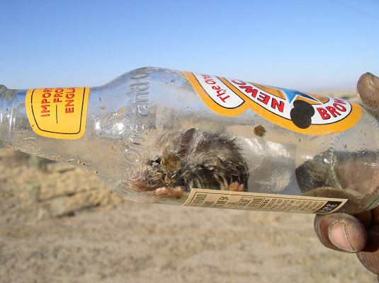 MOUSE LOSES LIFE IN DRUNKEN BINGE A Mouse person <we'll call him Oscar pending family notification> accidentally killed himself yesterday at an event held in the California Red Rock Desert called the "Intergalactic Away Mission - First Contact" www.awaymission.org. He apparently climbed into a half-full bottle of Newcastle beer, Thursday and drank himself into a stupor causing him to pass out, face down in the pool of elixir. Party-goers to the event later stated that they had seen the mouse in the bottle earlier, he had stripped off his Nemesis-era Star Trek Uniform and dove naked into the half full bottle. Spectators gawked as he pulled out a small section of a drinking straw and began gulping huge bong hits of the ice cold beer repeatedly, even hours later, all attempts to get the mouse to stop drinking failed. Later that evening many lodged complaints to security, and the local authorities of Foul language, racial epitaphs at the local ant population, and the increasingly loud raucous noises emanating from the now 1/4 full bottle. By 2:00 am many who attended say the music level, was so loud you could not carry on a conversation within 30' of the bottle. By 4:00 am the mouse became completely out of control, rocks and small balls of feces were hurled at anyone attempting to come near to calm him down. Thats when the staff arrived too clean the site, they found Oscar deceased, faced snout down in the deadly brew. It was also noted that there unfortunately was another 3 oz of liquid left, and had he not drowned, would have busted his gut anyway said the attending amateur pyro-technician Rabbi Dali Rick, who pronounced the little furry guy dead at 7:38 am Saturday. He drank so much that his waist size swelled to over twice it's normal girth, which also became a hindrance while trying to exit the bottle, which led to the drunken mouse standing at the mouth of the bottle and urinate openly in public, disgusting every one viewing the bizarre scene. One of the event attendees said in an interview over the phone "The beer is that good." This prompted an immediate response by the event management who stated "This will in no way affect the out of control drunken revelry at next years event. A study will commence too test the lifesaving effects of wearing a life-vest while drinking as an option. " They further stated that they intend to place a even sterner warning on the back of next years tickets. They were to busy planning a Newcastle beer bash in honor of Oscar to comment any further. Donations in the form of Newcastle beer and Albertson's Cheese party platters can be sent directly too the family of Oscar via the event Mgmt.